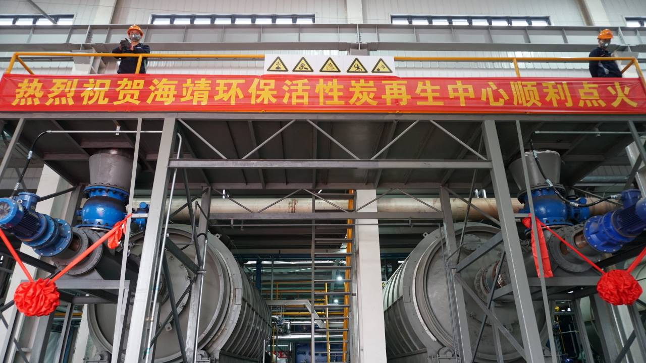 活動(dòng)現(xiàn)場(chǎng),隨著點(diǎn)火儀式的進(jìn)行,首批廢活性炭通過回轉(zhuǎn)窯高溫?zé)崽幚砑夹g(shù),經(jīng)過干燥、再生、活化、冷卻、篩分、包裝等一系列高溫?zé)嵩偕鞒蹋白兩怼睘樵偕钚蕴慨a(chǎn)品,可用于循環(huán)使用。這條廢棄活性炭熱處理再生生產(chǎn)線可再生處理廢活性炭2萬(wàn)噸/年。