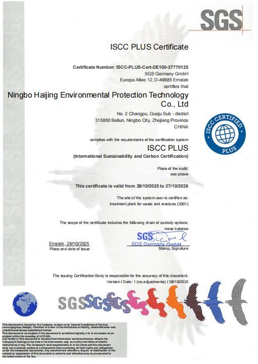 近日,寧波海靖環(huán)保科技有限公司憑借在油污水資源化利用領(lǐng)域的突出優(yōu)勢,正式通過國際權(quán)威機構(gòu)的嚴(yán)苛審核,成功斬獲ISCC(可持續(xù)發(fā)展與碳認(rèn)證)國際認(rèn)證證書。作為油污水及廢礦物油資源化利用行業(yè)首家獲得此項認(rèn)證的企業(yè),這一成果標(biāo)志著公司在可持續(xù)生產(chǎn)、碳足跡管理領(lǐng)域已達到國際領(lǐng)先水平,為公司向歐盟等國際客戶提供含油污水處理服務(wù)奠定了關(guān)鍵資質(zhì)基石。
