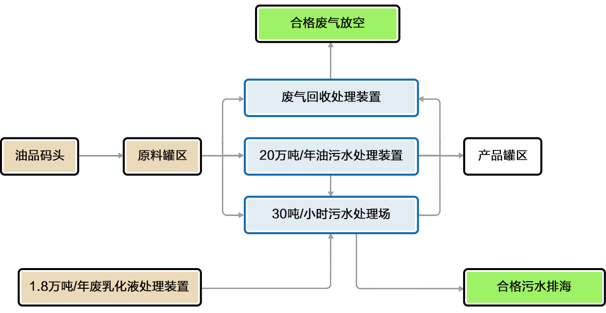 公司配套20萬噸/年油污水處理裝置一套; 一個(gè)原料儲(chǔ)罐區(qū)、 一個(gè)產(chǎn)品儲(chǔ)罐區(qū);配套30噸/小時(shí)廢水處理裝置一套;1.8萬噸/年廢乳化液處理裝置一套;4000立方 米/小時(shí)廢氣回收處理裝置一套。